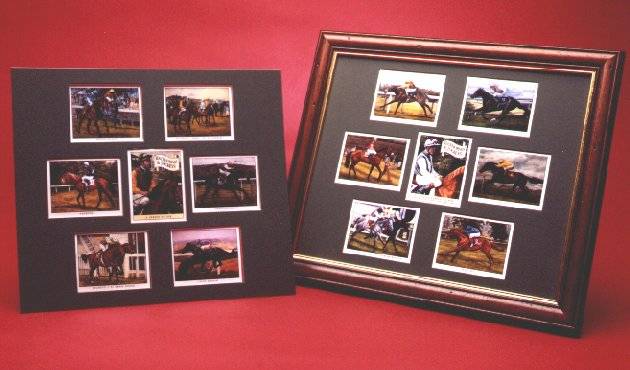 Each set of Collectors' Cards has a dark green mount and an attractive varnished wood frame with quality perspex back and front. Alternatively, the sets can be purchased in a special plastic sleeve with the mount, ready for the framing of your own choice. The two sets incorporate all the images on the postcards plus some additional pictures." Series I comprises: A top Card featuring the jockey Lester Piggott plus: Series II comprises: A top Card featuring the jockey Pat Eddery plus: