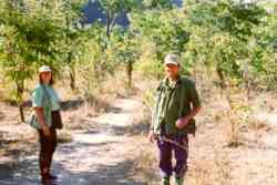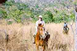 We rode for approximately 2 hours through varied terrain, until stopping for lunch. We dismounted, unsaddled the horses, and walked a short distance to a beautiful clear pool where we decided to have our picnic lunch. We were joined by several little lizards who obviously regarded Jane as a friend and happily ate our crumbs. Gordon decided the rock pool looked too tempting and was brave enough to venture in for a swim. Although the mid day temperature was extremely pleasant, the water temperature was extremely cold. I think he succeeded in frightening the Lizards!