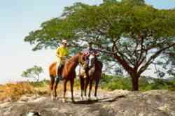 After descending the mountain and consuming a hearty breakfast we were back in the saddle ready for our day's adventures. Again the terrain was varied and interesting. Jane constantly keeping us informed about the vegetation, wildlife and terrain. We saw Bushpig, a pair of Warthogs who apparently are nearly always seen in pairs as they mate for life, and various members of the antelope family. We stopped again for a picnic lunch by a river. During our lunch break Jane took us on a clambering expedition up-river as during the rainy season this would have the most spectacular waterfalls. As always our exertions were rewarded with wonderful scenery and a birds-eye view of Terrapins playing in the pools below us. In the afternoon we rode back towards Bat Caves camp down some of the steepest terrain, and yet the horses did not stumble. They can confidently negotiate the most remarkable inclines.