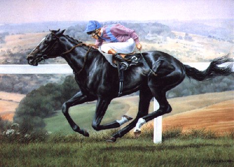 "This was the second commission that I had to paint Chief Singer. I had already painted him winning the July Cup so I chose to show him at Goodwood where he won the Sussex Stakes. It provides such a spectacular backdrop for any picture that it would be hard to find a better setting for a magnificent thoroughbred such as Chief Singer. He was a wonderful looking horse, almost black and he had a terrific stride. In this picture I have chosen to show him at the point of gallop where the horse's body is suspended momentarily in mid air with the Downland landscape falling away behind him, hopefully creating quite a spectacular image." |
